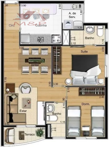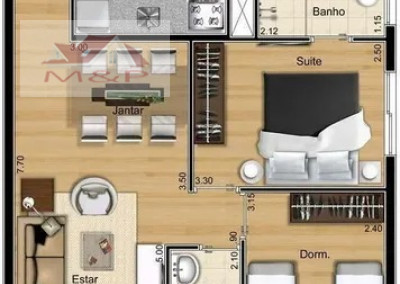 Imóvel com 2 Dormitórios, sendo 1 suíte, 1 banheiro, 1 sala, 1 sala de jantar, 1 Área de serviço 1 vaga na garagem.