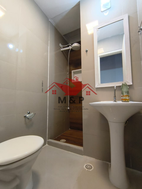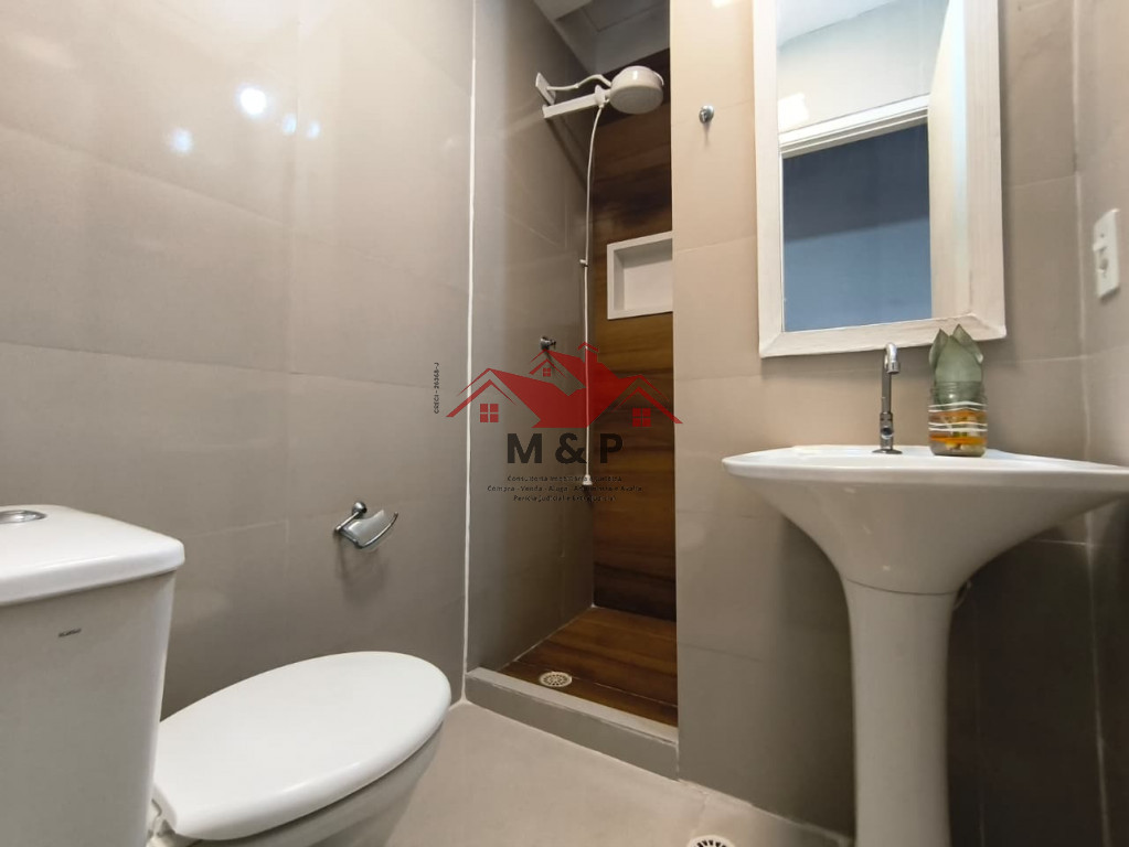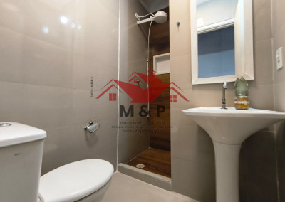 Banheiro Superior: Reformado com porcelanato de formato grande e revestimento completo.