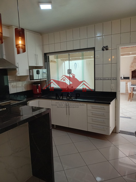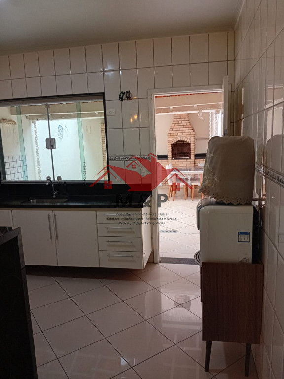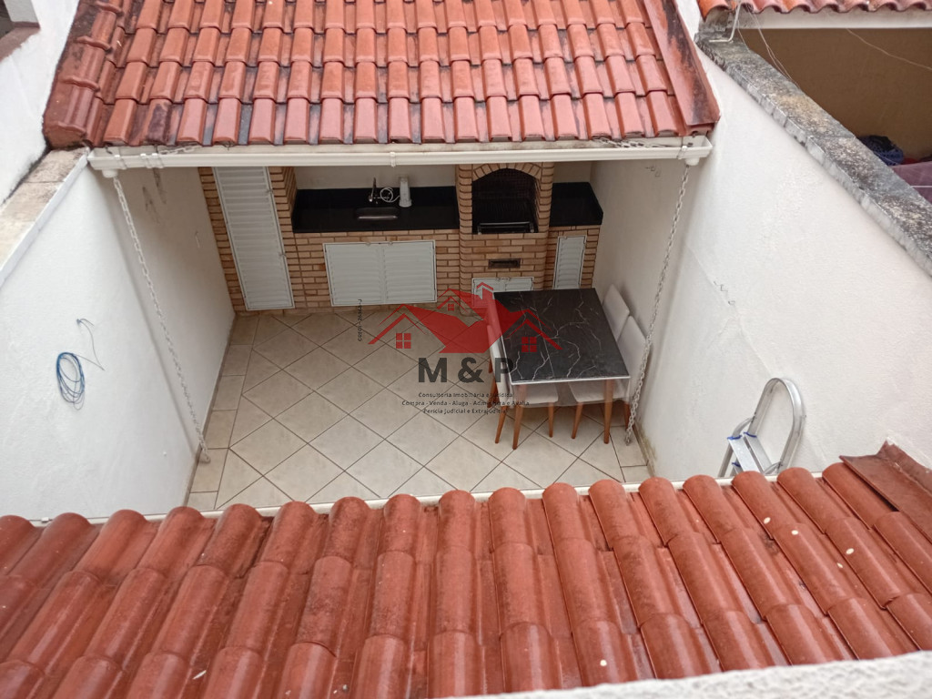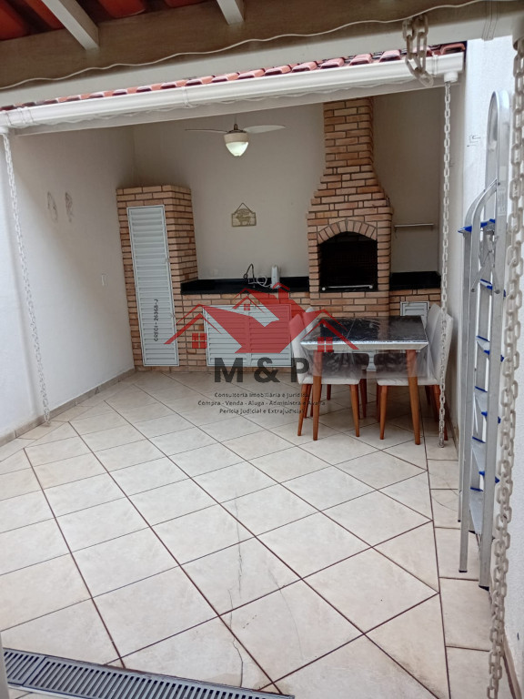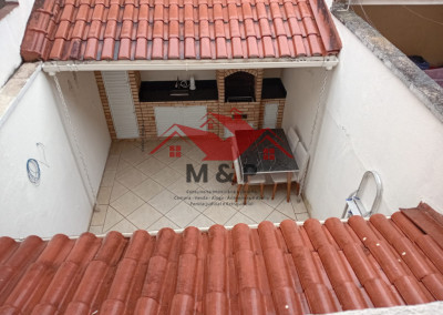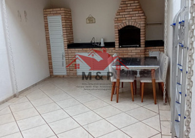 Para o lazer, o sobrado oferece um espaço gourmet completo, com churrasqueira em tijolinho e bancada de apoio.