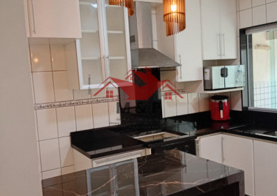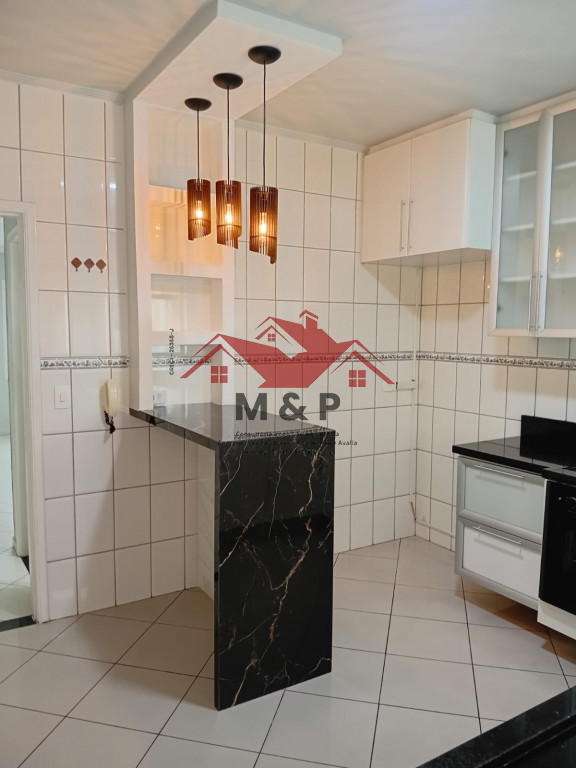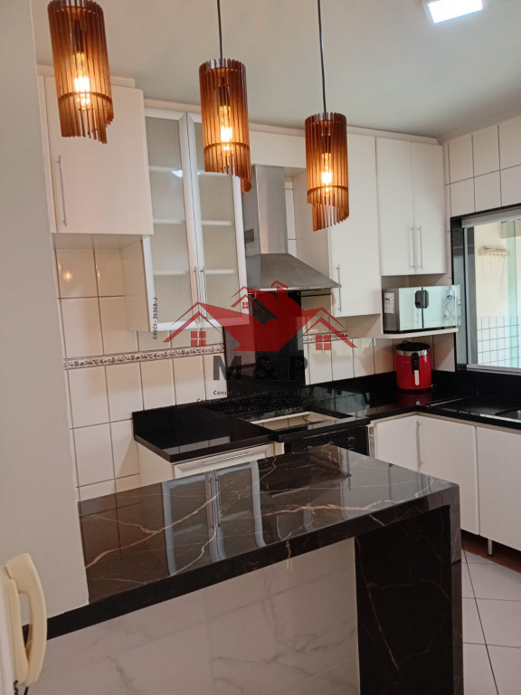 A cozinha é um verdadeiro destaque, com bancada em granito escuro, armários sob medida e luminárias pendentes modernas.